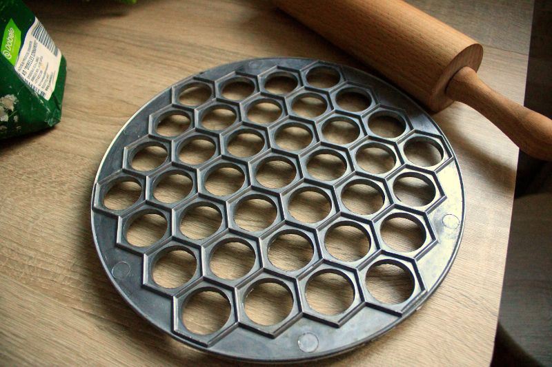 Izrullējiet otru mīklas kārtu, uzklājiet to virsū un ar rulli viegli pārbrauciet, pakāpeniski spiežot arvien stiprāk, līdz iezīmējas atsevišķi pelmeņi. Tad ar pirkstiem uzmanīgi izņemiet tos no formas.