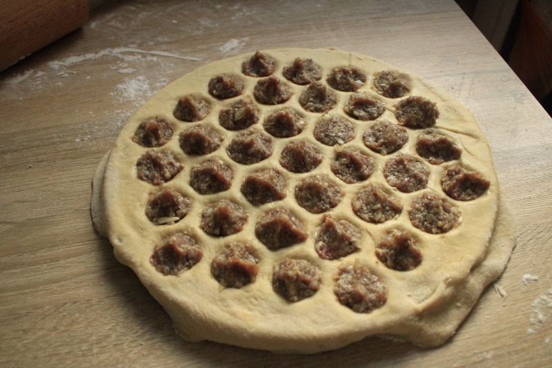 Nelielu mīklas gabalu izrullējiet nedaudz lielāku, nekā nepieciešams pelmeņu formai. Slānim jābūt plānam, taču nevajag pārspīlēt – pretējā gadījumā, pildot ar gaļu, pelmeņi var ieplīst. Formu apkaisiet ar miltiem, lai mīkla uz tās nepieliptu, uzklājiet mīklas kārtu, ar pirkstiem viegli iespiežot iedobītes, un piepildiet tās ar gaļas bumbiņām apmēram pus tējkarotes lielumā.