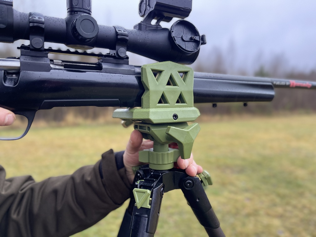 Vēl viena ne mazāk nozīmīga detaļa ir ieroča atbalsts. Kādreiz biežāk, bet arī laiku pa laikam tagad mēdz atskanēt viedoklis, ka atbalstu jeb tā saucamo štoku medībās lieto tikai vārguļi. Sak, vai tad nu īstam medniekam plinte vispār mēdz būt par smagu un roka par drebelīgu, vai ne? Un tomēr noliegt nevar – atbalsts krietni samazina kļūdu risku, jo šad tad kļūdāmies mēs visi. Aizrunājamies par šo tēmu ar Armandu, un arī viņš atzīst, ka atbalstu medībās lieto regulāri. Sākot medīt, pirmā doma neesot bijusi iegādāties atbalstu, taču jau tad, medījot uz pieiešanu, mežmalas krūmi bijuši apšķērēti, meklējot taisnu, stingru zaru ar žākli galā. Runa nav par neprasmi raidīt šāvienu, turot ieroci rokās, bet gan par risku mazināšanu un atbildības sajūtu, zinot, ka ierocis tiek pavērsts pret dzīvu būtni. Armands pats ikdienā izvēlas un par visstabilāko uzskata četrpunktu atbalstu no Deerhunter. Protams, tas nav vienīgais pareizais risinājums, jo, tāpat kā medību situācijas atšķiras, tā arī šaušanas atbalsti ir dažādi un katram ir sava specifika. Šī iemesla dēļ esam paņēmuši uz šautuvi līdzi trīs dažādas uzbūves ieroča atbalstus no ražotāja Primos, lai apskatītu, kā tie savstarpēji atšķiras, kurš ir vieglākais pārnēsāšanas ziņā un kurš piedāvā visstabilāko šaušanu. Kopējais visiem atbalstiem ir trīs kāju statīvs, bet atšķiras ieroča atbalsta punktu skaits un veids.