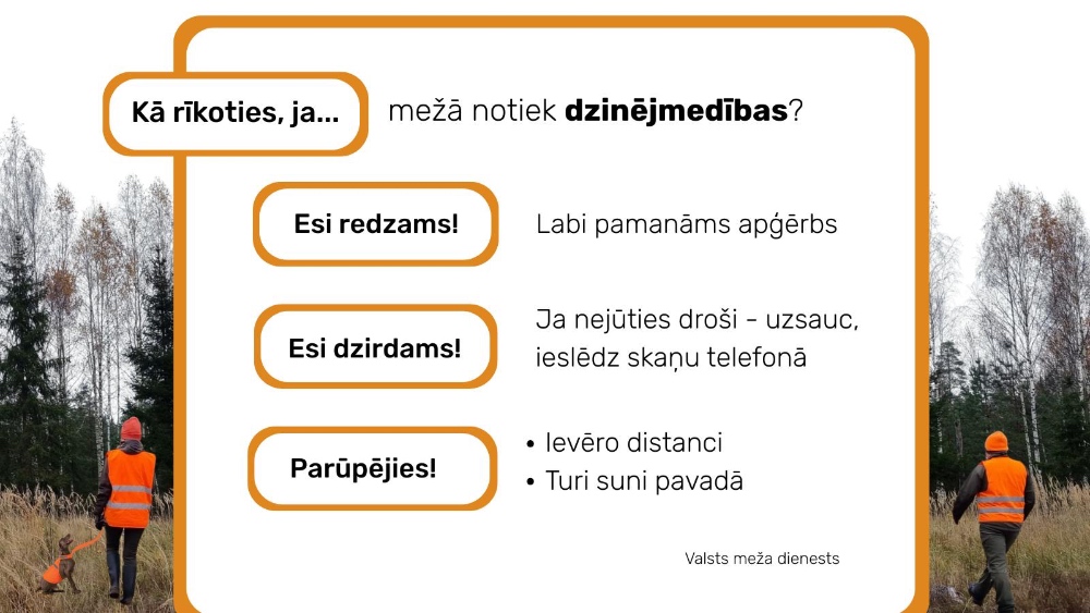 Valsts meža dienests atgādina, ka Latvijā no 1. oktobra līdz 31. martam ir atļautas dzinējmedības – tad mežos atrodas lielāks skaits mednieku un dzinēju. Iedzīvotājiem, kas nejūtas par to droši, der atcerēties trīs ieteikumus – esi redzams, esi dzirdams, parūpējies!