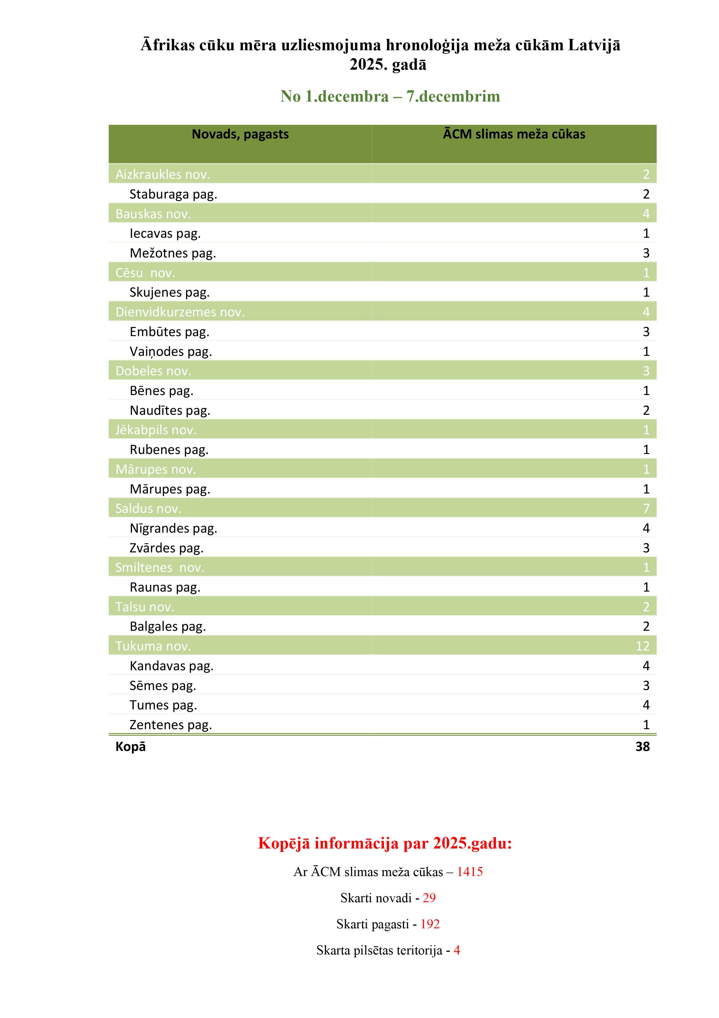 Ikdnedēļas ziņojumā par Āfrikas cūku mēra uzliesmojumiem, ko nosūta Pārtikas un veterinārais dienests, redzams, ka pieaudzis slimo mežacūku skaits. Kopā visā Latvijā no 1. līdz 7. decembrim konstatētas 38 slimas mežacūkas. Kopā 2025. gadā konstatētas 1415 ar mēri slimas mežacūkas, kas ir par 142 vairāk nekā pērn šajā pašā laika periodā. Kopā skarti 29 novadi un 192 pagasti, un 4 pilsētas teritorijas.