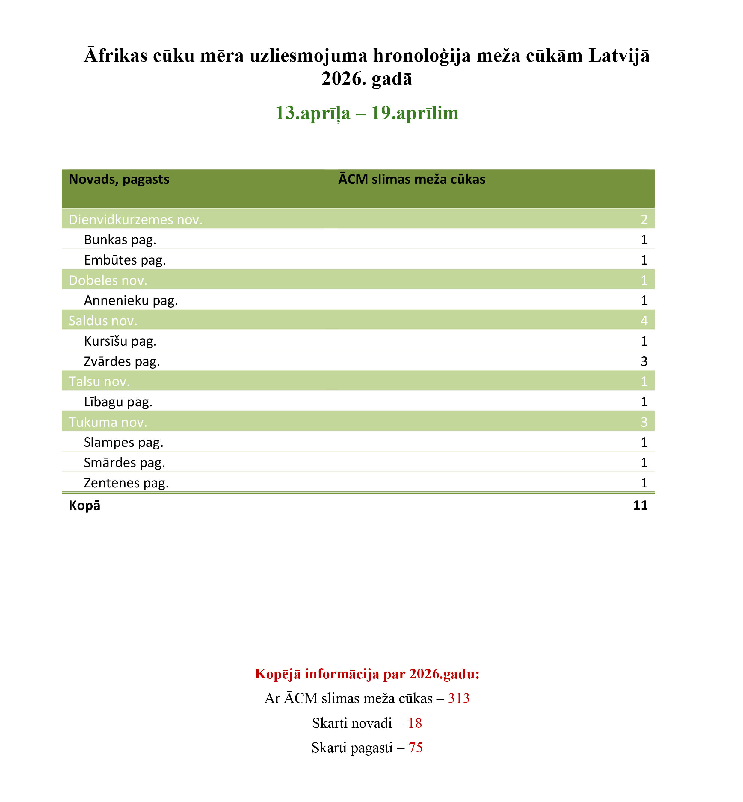 Ikdnedēļas ziņojumā par Āfrikas cūku mēra uzliesmojumiem, ko nosūta Pārtikas un veterinārais dienests, redzams, ka pieaudzis slimo mežacūku skaits, no 13. līdz 19. aprīlim konstatētas 11 slimas mežacūkas. Kopā 2026. gadā visā Latvijā konstatētas 313 slimas mežacūkas, skarti 18 novadi un 75 pagasti.