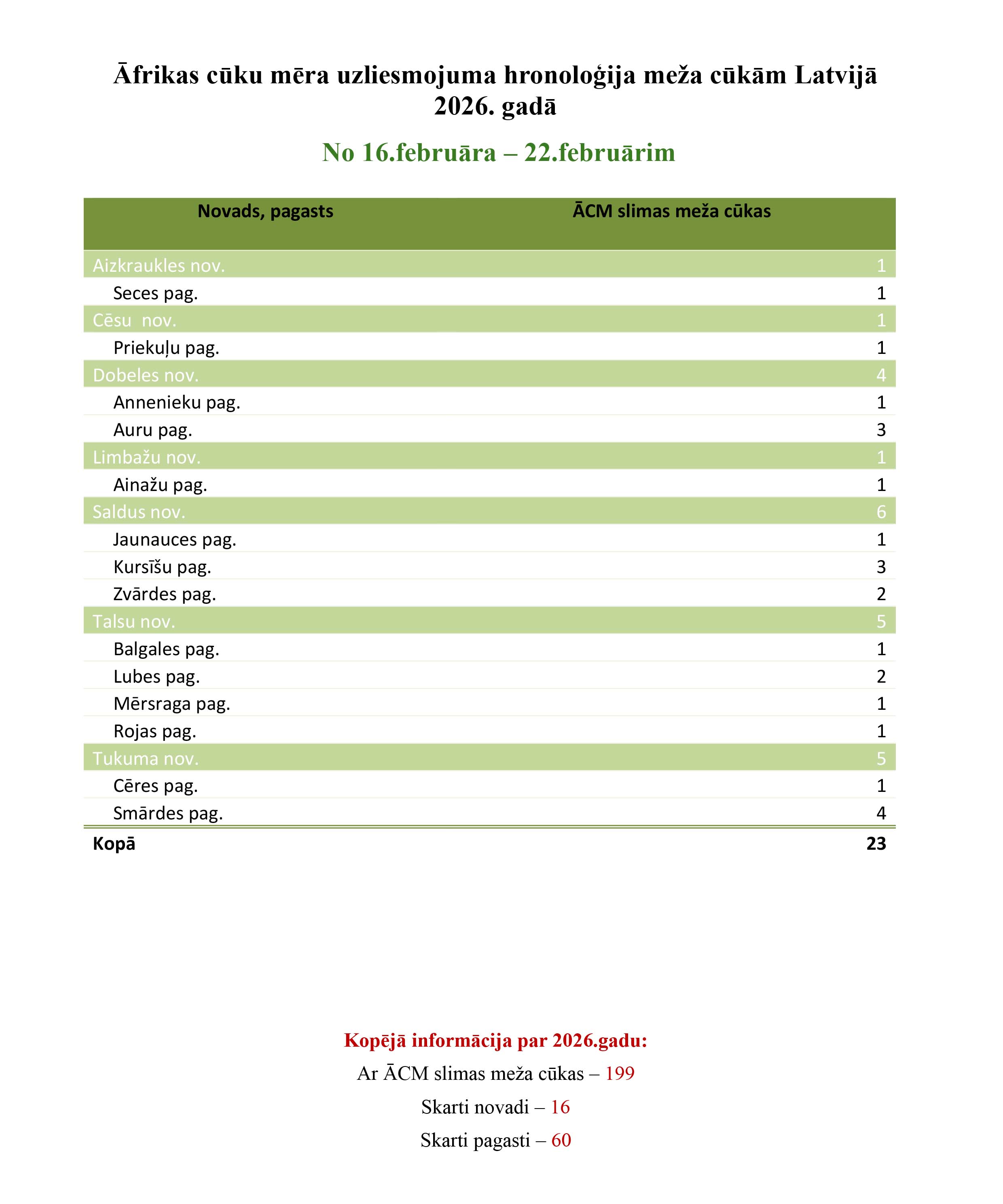 Ikdnedēļas ziņojumā par Āfrikas cūku mēra uzliesmojumiem, ko nosūta Pārtikas un veterinārais dienests, redzams, ka pieaudzis slimo mežacūku skaits, no 16. līdz 22. februārim konstatētas 23 slimas mežacūkas. Kopā 2026. gadā visā Latvijā konstatētas 199 slimas mežacūkas, skarti 16 novadi un 60 pagasti.