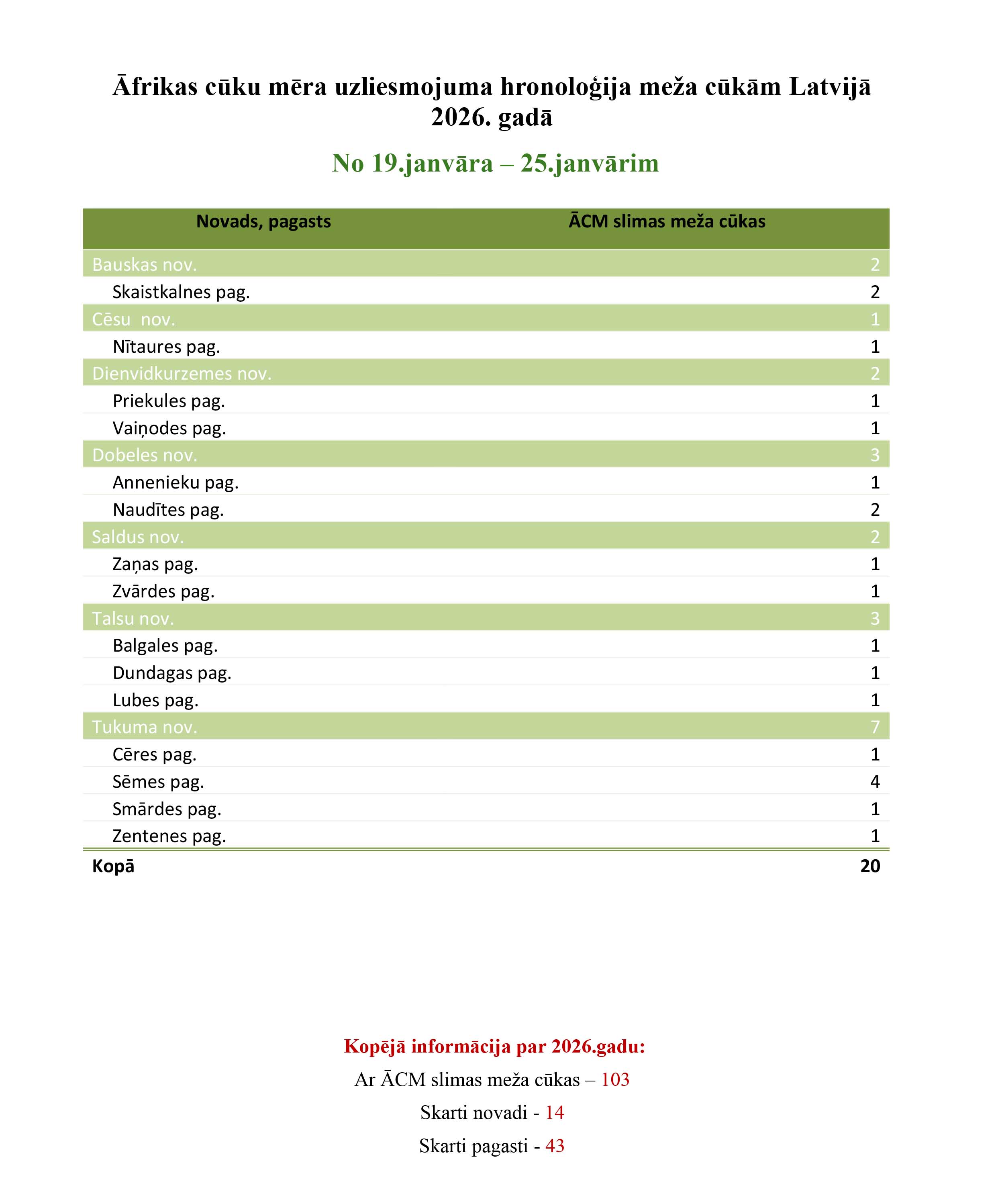 Ikdnedēļas ziņojumā par Āfrikas cūku mēra uzliesmojumiem, ko nosūta Pārtikas un veterinārais dienests, redzams, ka pieaudzis slimo mežacūku skaits. Kopā visā Latvijā no 19. līdz 25. janvārim konstatētas 103 slimas mežacūkas. Kopā skarti 14 novadi un 43 pagasti.