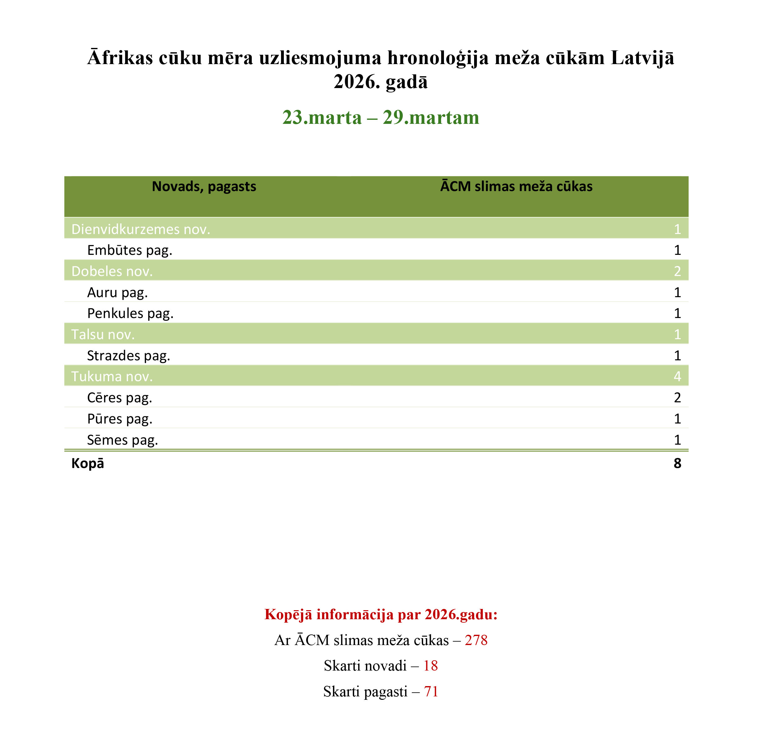 Ikdnedēļas ziņojumā par Āfrikas cūku mēra uzliesmojumiem, ko nosūta Pārtikas un veterinārais dienests, redzams, ka pieaudzis slimo mežacūku skaits, no 23. līdz 29. martam konstatētas 8 slimas mežacūkas. Kopā 2026. gadā visā Latvijā konstatētas 278 slimas mežacūkas, skarti 18 novadi un 71 pagasts.