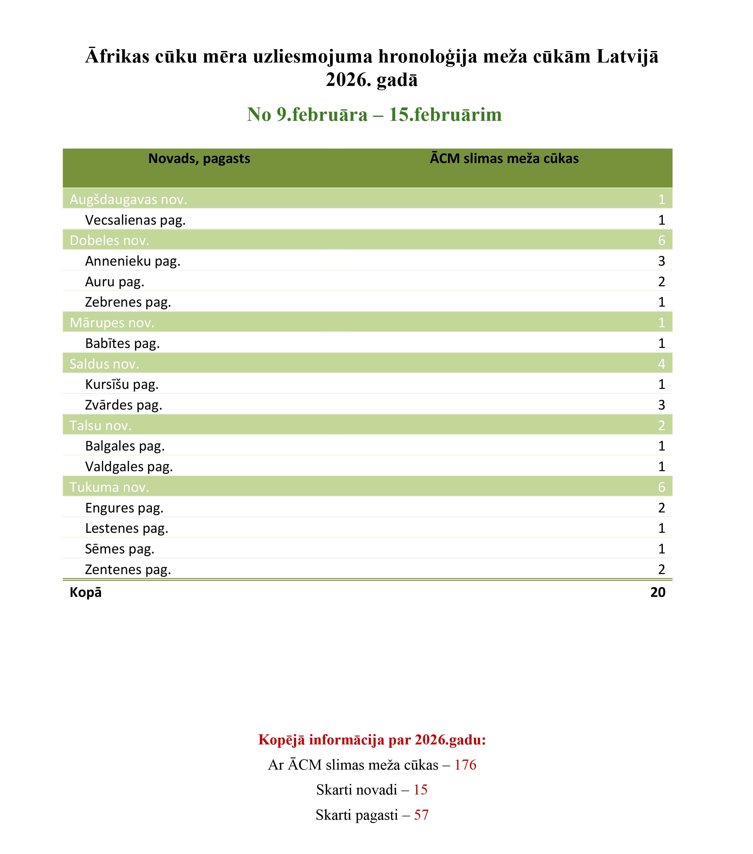 Ikdnedēļas ziņojumā par Āfrikas cūku mēra uzliesmojumiem, ko nosūta Pārtikas un veterinārais dienests, redzams, ka pieaudzis slimo mežacūku skaits, no 9. līdz 15. februārim konstatētas 20 slimas mežacūkas. Kopā 2026. gadā visā Latvijā konstatētas 176 slimas mežacūkas, skarti 15 novadi un 57 pagasti.