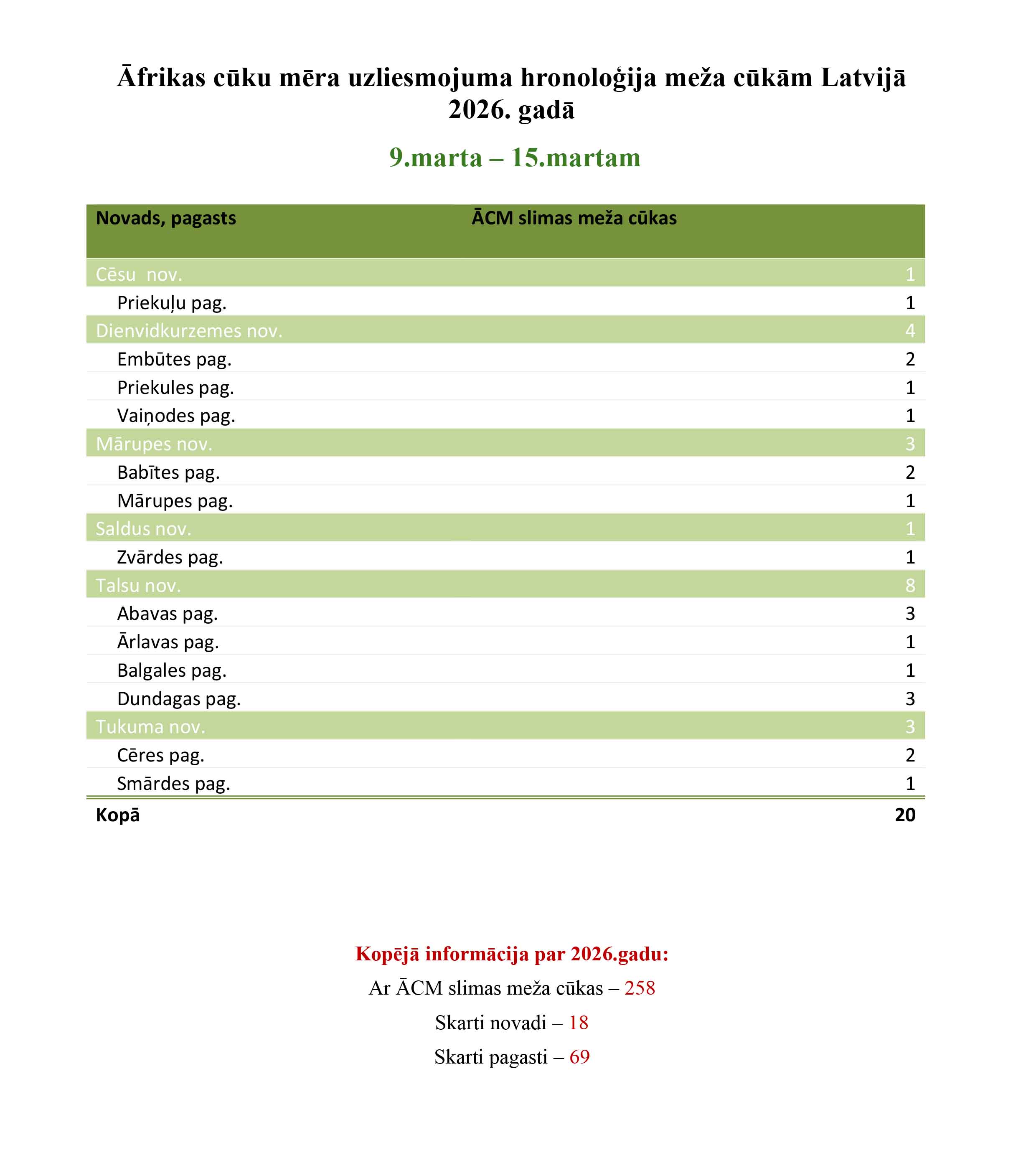 Ikdnedēļas ziņojumā par Āfrikas cūku mēra uzliesmojumiem, ko nosūta Pārtikas un veterinārais dienests, redzams, ka pieaudzis slimo mežacūku skaits, no 9. līdz 15. martam konstatētas 20 slimas mežacūkas. Kopā 2026. gadā visā Latvijā konstatētas 258 slimas mežacūkas, skarti 18 novadi un 69 pagasti.