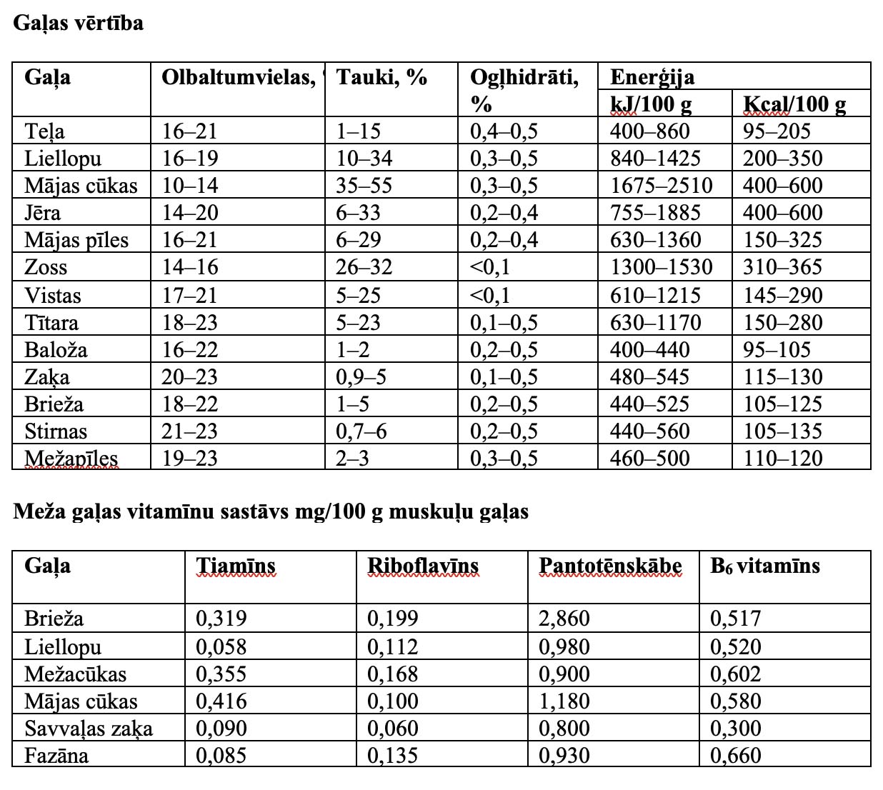 Vitamīni. Atkarībā no gaļas veida atšķiras arī gaļas vitamīnu sastāvs, piemēram, brieža gaļa pārspēj liellopu gaļu tiamīna, riboflavīna un pantotēnskābes daudzuma ziņā. Savukārt mežacūkas gaļā ir vairāk B6 vitamīna un riboflavīna, savukārt mājas cūkas gaļā ir vairāk tiamīna un pantotēnskābes.