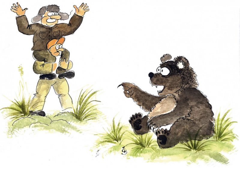 Abi sastingām. Doma par zosu medībām vairs nebūt nešķita tik jauka, un ar trim zosīm mugursomā no lāča pa purvu nespētu aizbēgt neviens… Lācis noteikti mūs bija jau saklausījis pa labu gabalu. Tas piecēlās pakaļkājās un vēroja, novērtējot pretiniekus. Tajā brīdī nošņācos: “Janka, lec man mugurā!” Viņam divas reizes nebija jāsaka! Vēl šodien nesaprotu, kā viņš sekundes laikā bija man kamiešos un vēl pēc sekundes sēdēja uz mugursomas un izpleta rokas virs galvas! Lācis pēkšņi nolaidās uz visām četrām, klusu nočāpstināja, izdarīja secinājumus par saviem šī vakara plāniem, pagriezās un devās savās gaitās… Tas nebija gaidījis, ka no purva viņam pretī iznāks vēl lielāks lācis.