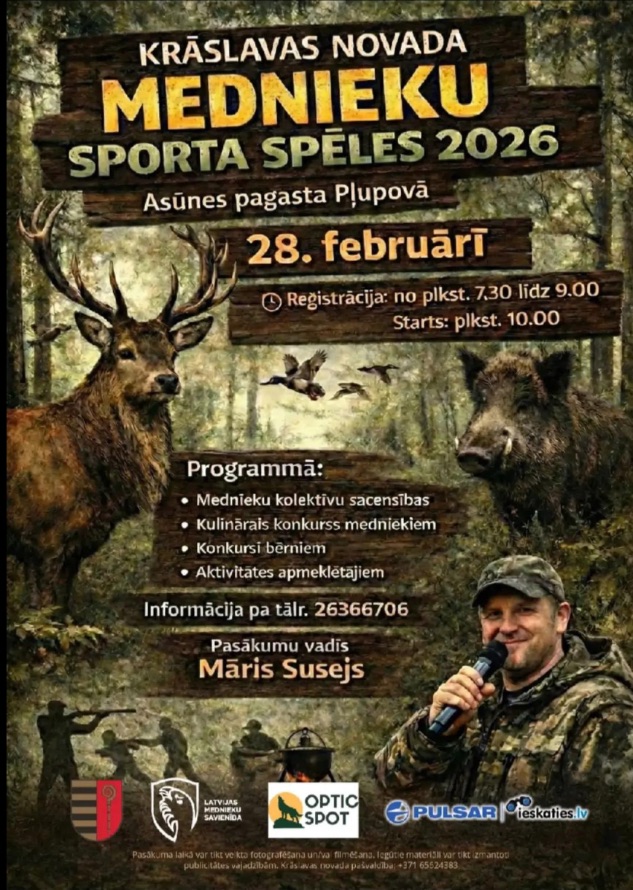28. februārī Asūnas pagasta Pļupovā norisināsies Krāslavas novada mednieku sporta spēles. Dienas gaitā notiks mednieku kolektīvu sacensības, kulinārais konkurss, konkursi bērniem, Latvijas Mednieku savienības valdes priekšsēdētaja Jura Bukševica un pēdu meklēšanas suņu biedrības HuntSafe seminārs, aktivitātes apmeklētājiem. Reģistrācija notiek no plkst. 07.30 līdz 09.00, savukārt starts plānots plkst. 10.00. Pasākumu vadīs Māris Susejs, vairāk informācijas, zvanot pa tālruni 26366706.