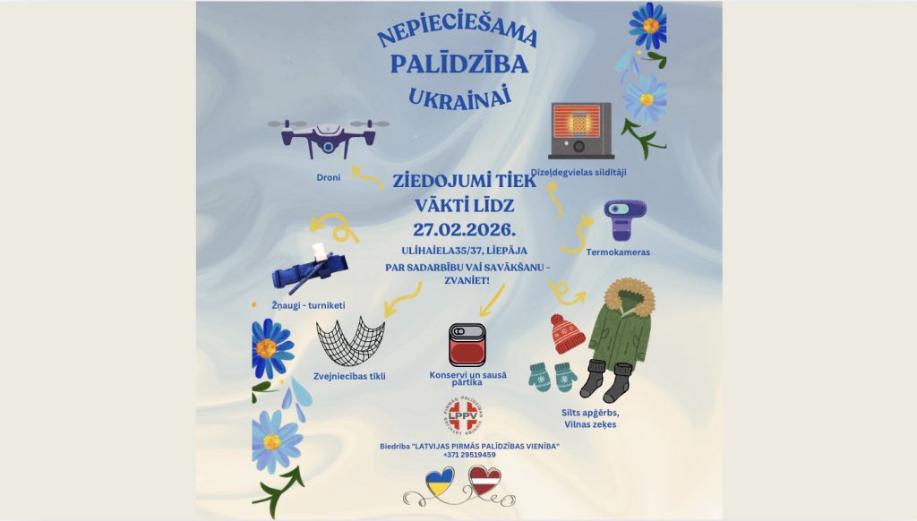 Atbalsts Ukrainai šobrīd ir īpaši svarīgs — biedrība Latvijas pirmās palīdzības vienība aicina iesaistīties un nogādāt nepieciešamās lietas ziedojumu punktā Liepāja.