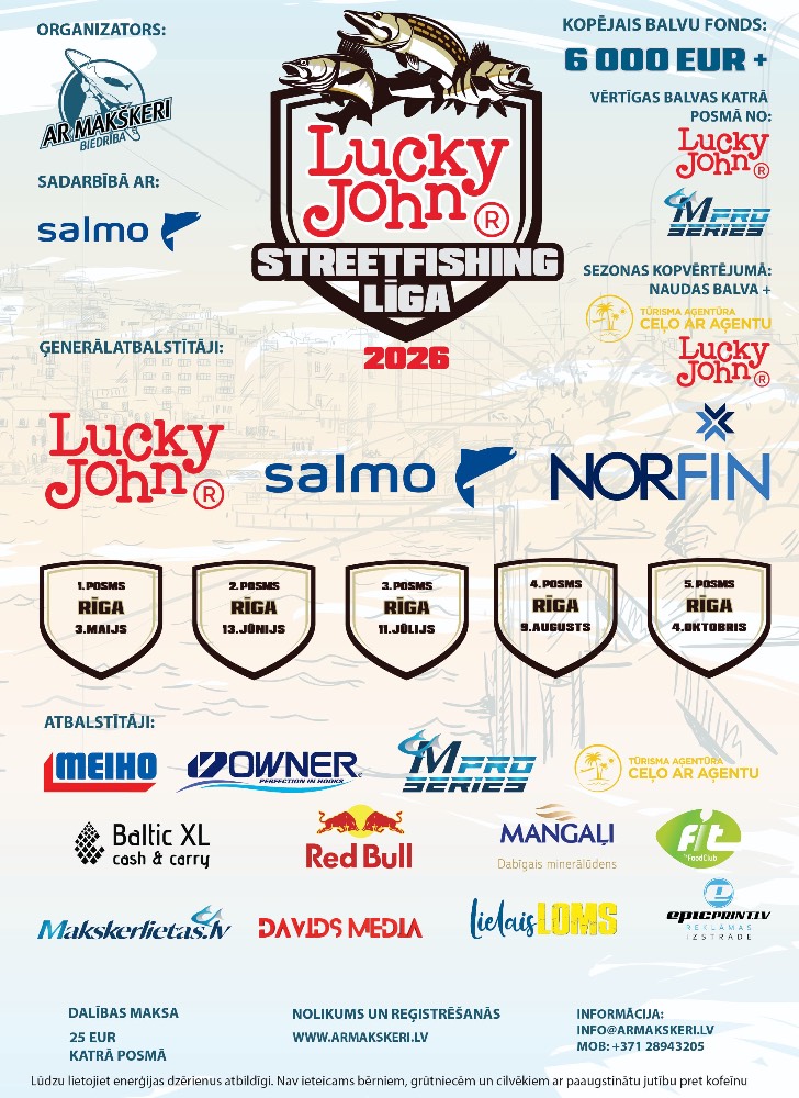 3. maijā Rīgā (Lucavsalā blakus laivu ielaišanas vietai) tiks atklāta Lucky John Streetfishing līgas sezona. Šogad organizatori ir pamainījuši norises vietas – šoreiz visi posmi notiks Rīgā, turklāt būt divi vakara posmi. Notikušas arī izmaiņas noteikumos – visi tik ļoti gribēja skriet un tagad tas būs atļauts, kā arī varēs izmantot velosipēdus. Sezonas kopvērtējumu veidos katra dalībnieka četru labāko posmu rezultāts no pieciem posmiem. Par vērtīgām balvām parūpēsies sacensību atbalstītāji.