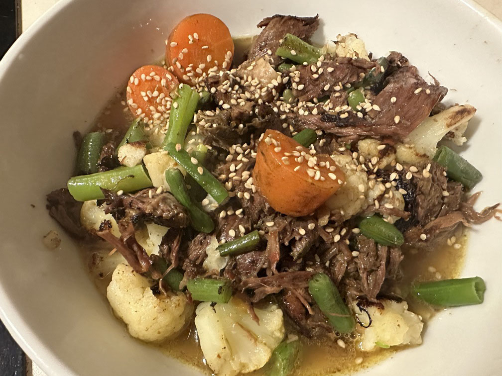 Jo vairāk buljona pievienosi, jo ēdiens būs vairāk kā zupa. Jo mazāk – jo biezāks un koncentrētāks sautējums. Garšu šajā brīdī var koriģēt – pievienot vēl sāli, piparus vai citas garšvielas. Dažkārt var pielikt nelielu skābumu vai pikantumu, bet tas jau ir katra paša gaumes jautājums. Labs risinājums ir arī nedaudz pievienota sojas mērce – tas dos sāļumu un pikantumu.