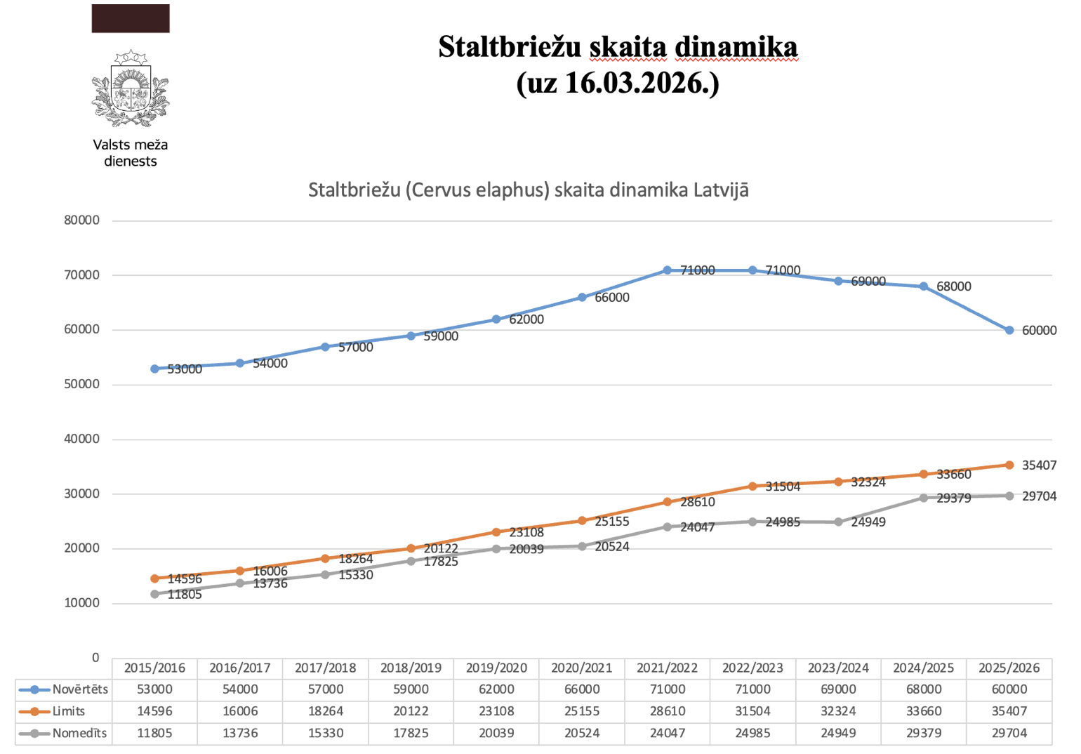 Tieši šajā kontekstā izskan brīdinājums par iespējamu lūzumpunktu – brīdi, kad populācijas samazināšanās kļūst pārāk strauja un nākotnē nāktos domāt nevis par skaita ierobežošanu, bet gan par populācijas atjaunošanu un kvalitātes saglabāšanu. Vienlaikus jāskatās arī plašāk – staltbrieži ir būtiska barības bāze lielajiem plēsējiem, un to straujš kritums var ietekmēt vilku un lāču uzvedību, radot jaunus izaicinājumus lauku teritorijās.