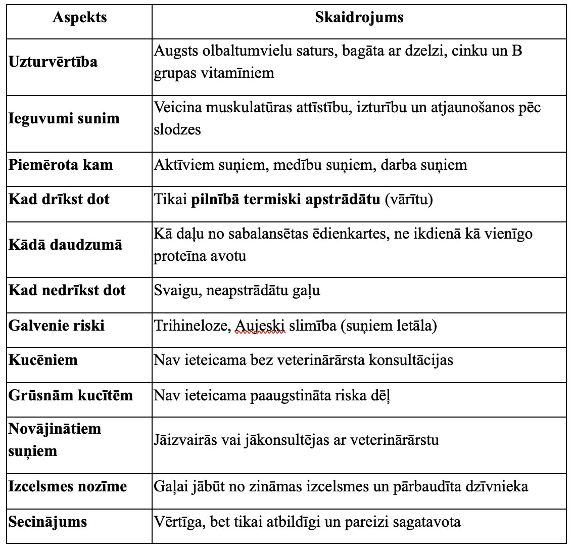 Īpaša piesardzība jāievēro kucēnu, grūsnu kucīšu un novājinātu suņu barošanā – šajos gadījumos mežacūkas gaļa nav ieteicama bez veterinārārsta izvērtējuma. Secinājums ir vienkāršs – mežacūkas gaļa var būt vērtīga suņa barībā, bet tikai tad, ja tā ir pienācīgi termiski apstrādāta un izmantota atbildīgi.