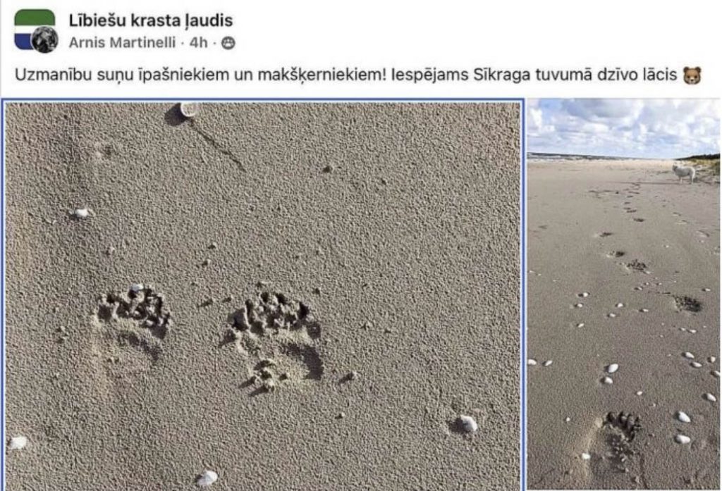 Ziemeļkurzemē jūras piekrastē manīts lācis – par to liecina sociālo tīklu grupā Lībiešu krasta ļaudis publicētās fotogrāfijas ar lāča pēdām piekrastes smiltīs un Slīteres Nacionālā parka pārstāvju ziņotais.
