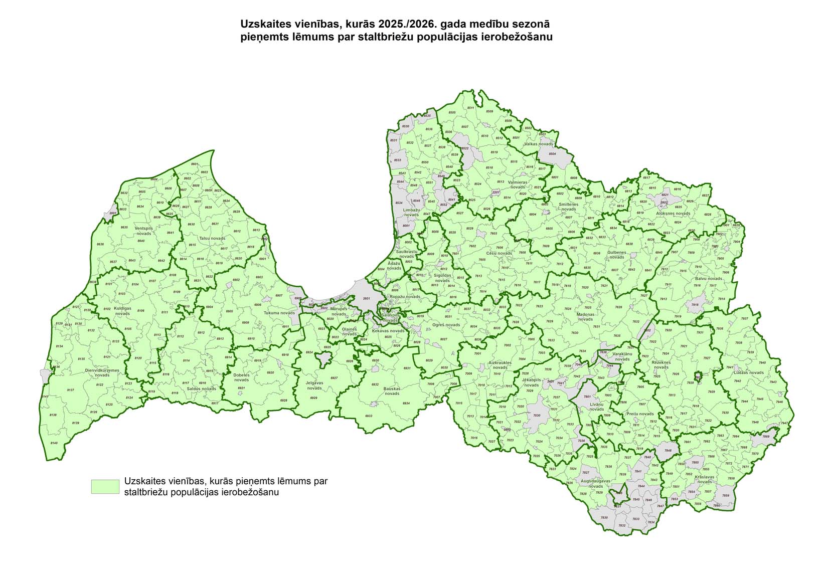 KARTE. Uzskaites vienības, kurās 2025./2026. gada medību sezonā pieņemts lēmums par staltbriežu populācijas ierobežošanu