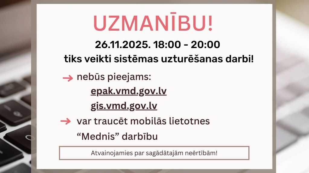 Notiks sistēmas uzturēšanas darbi! Rīt, 2025. gada 26.novembrī no 18:00 līdz 20:00 nebūs pieejami Meža valsts reģistrs un Valsts meža dienesta e-pakalpojumi, jo tiks veikti sistēmas uzturēšanas darbi. Var būt traucēts arī savienojums ar lietotni Mednis. Atvainojamies par sagādātajām neērtībām.